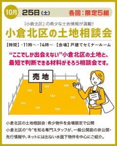 大人気の小倉北区の希少物件を会場限定公開⁉まだネットには出ていない物件を中心に紹介します。最短で判断できる材料がそろう相談会です。小倉北区で土地探しを検討されている方必見ですよ~!