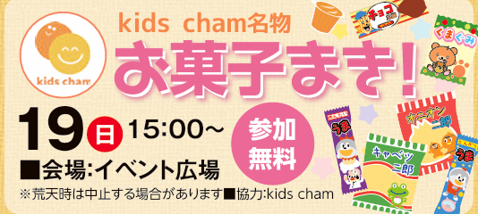 キッズチャム名物のお菓子まきも開催します!いろんな種類のお菓子を用意しております。拾ったお菓子を入れる袋を持ってたくさんキャッチしてください♪この日のおやつはこれで決まりですね~!参加費は無料で、子どもたちも保護者も盛り上がるイベントとなっていますのでぜひ参加してくださいね。