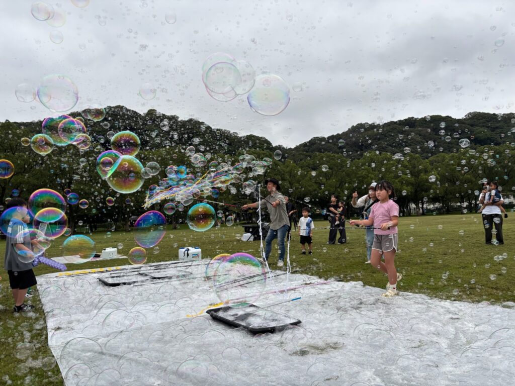 シャボン玉師が使用しているバブルリングを使ったシャボン玉遊びもあり、子どもも大人も楽しそうに体験していました。