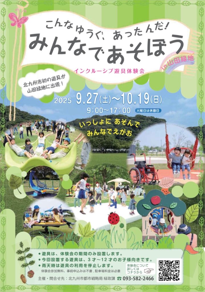 2025年10月19日まで北九州市初のインクルーシブ遊具が山田緑地に登場しています。インクルーシブ遊具とは障害の有無、年齢、性別などに関わらず、だれでも同じ場所で楽しむことができる遊具のことです。少しずつ過ごしやすい気候になってきたので、ぜひ遊びに行ってみてくださいね。
