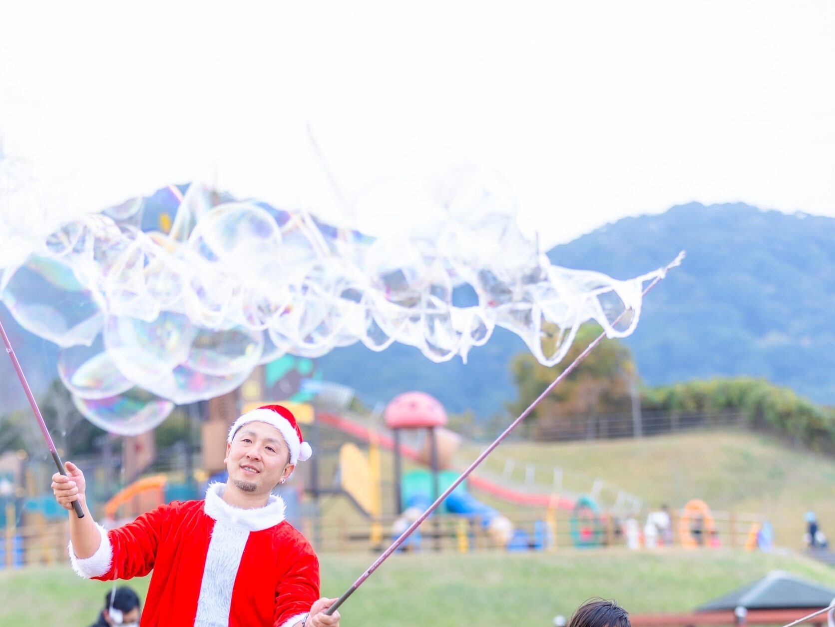大小さまざまなシャボン玉がふわりと空を舞い、その一つひとつがキラキラと光を反射してとても幻想的。まるで冬の空に広がる小さな魔法の粒のようで、思わず大人も見とれてしまうほど綺麗です。そのコントラストがまた可愛くて、写真にも映えること間違いなしですよ☆