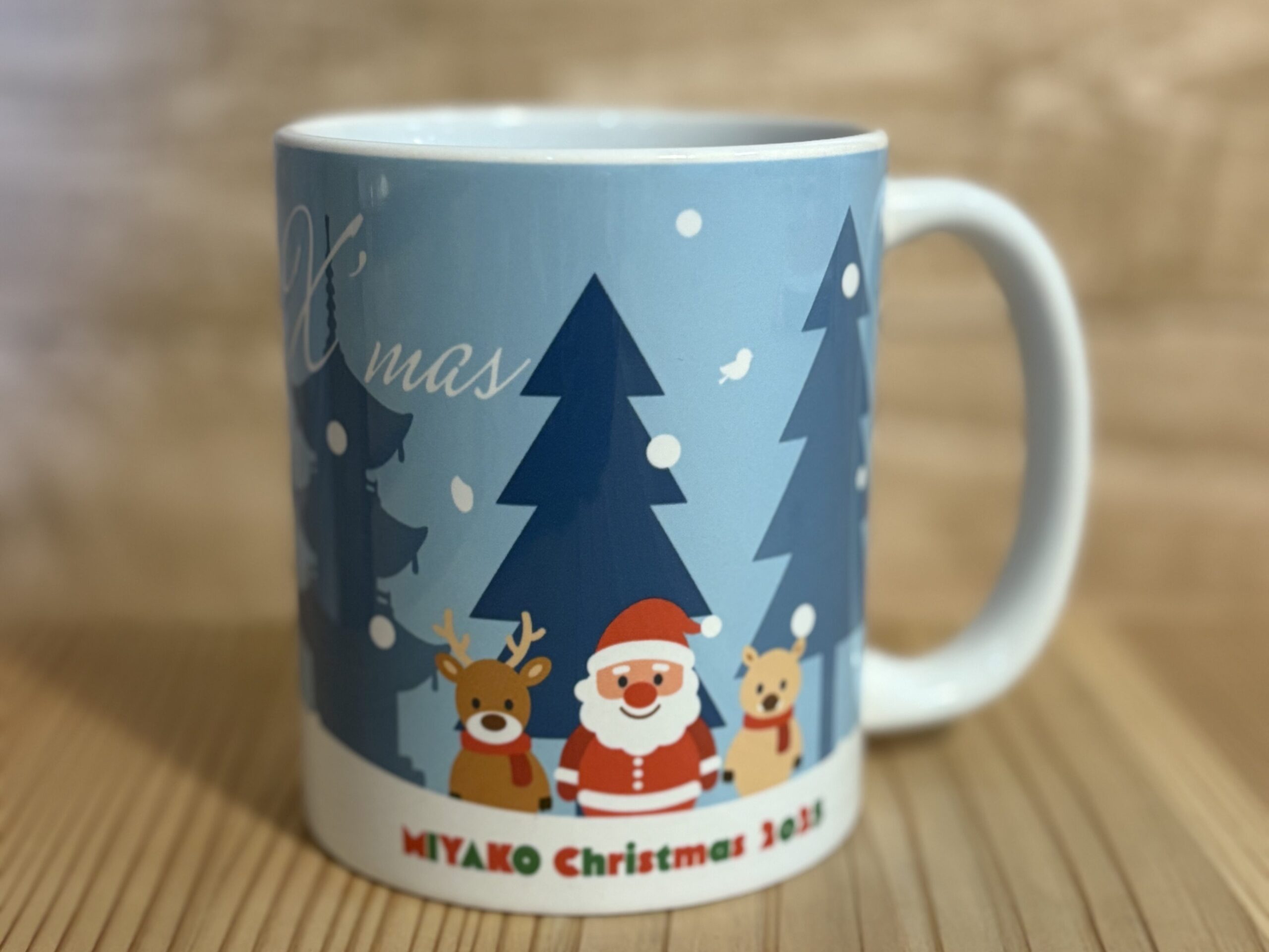 「みやこ」がたくさん詰まった可愛いデザイン。可愛いサンタクロースの隣には、みやこ町にたくさんいる鹿と、、、猪!!雪の結晶の中にはみやこ町の特産品が隠れている“とびきり可愛い”特製マグカップです。