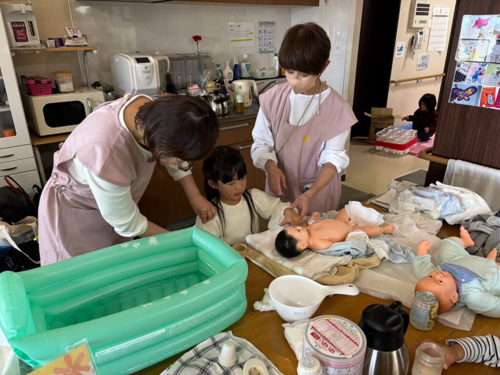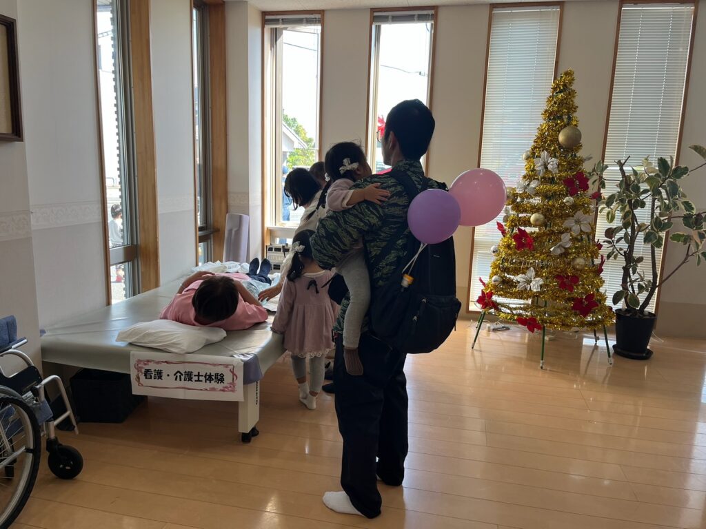 介護士体験では大人のおむつ交換を体験しました。赤ちゃんのお世話とはまったく違うポイントが多く、先生の説明に一生懸命耳を傾けていました。保護者の方からは「知らないことばかりだった」「勉強になるね」といった声が聞こえていました。家族で“介護を知るきっかけ”になったように感じました。