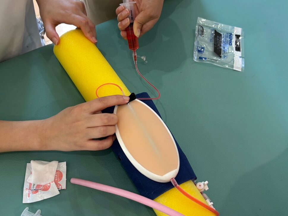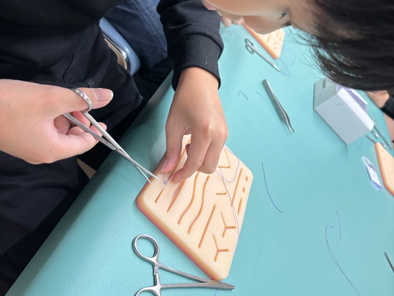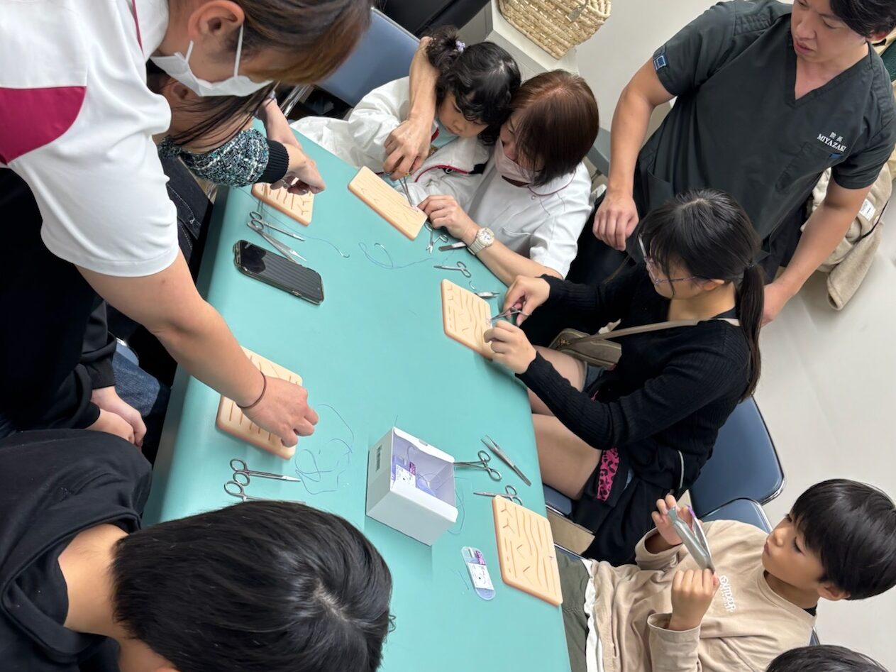 手術に使用する本物の針を使って縫合にチャレンジ!子どもたちは最初ドキドキ…。先生や看護師さんが優しくサポートしてくださり、気づけばみんな全集中!「できた!」と誇らしげに見せてくれる姿がとても可愛かったです。