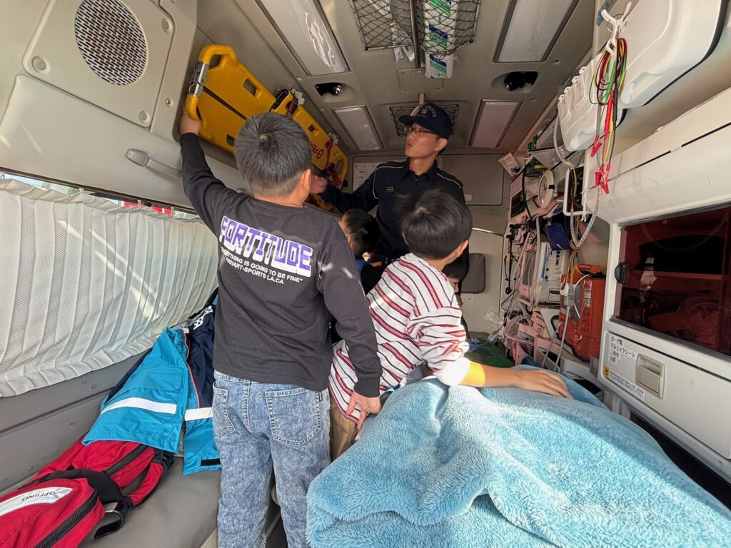 消火体験では火の的に向かって消火器を噴射。とても上手にできていました!ミニ防火服に着替えたちびっこ消防士たちが、とにかく可愛い!救急車の中に乗り込み、機材の説明を聞いたり、本物の消防車と救急車との写真撮影したりと終日大人気でした。