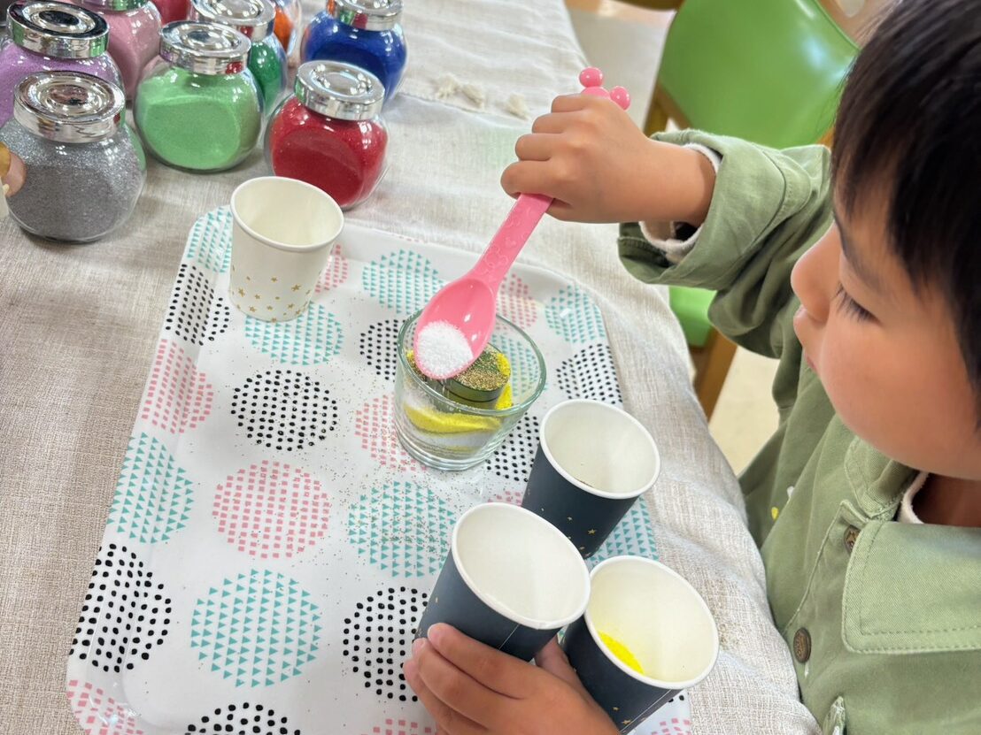 お菓子屋さんブース付近は甘い良い香りがして「良い匂いがする~!」と子どもたちはワクワク。好きな色や味の金平糖を選び、世界に一つだけの金平糖ボトルが完成!小さな手でぎゅっとビンを持ちながら、大事に大事に持ち帰る姿に、思わず笑顔になりました。