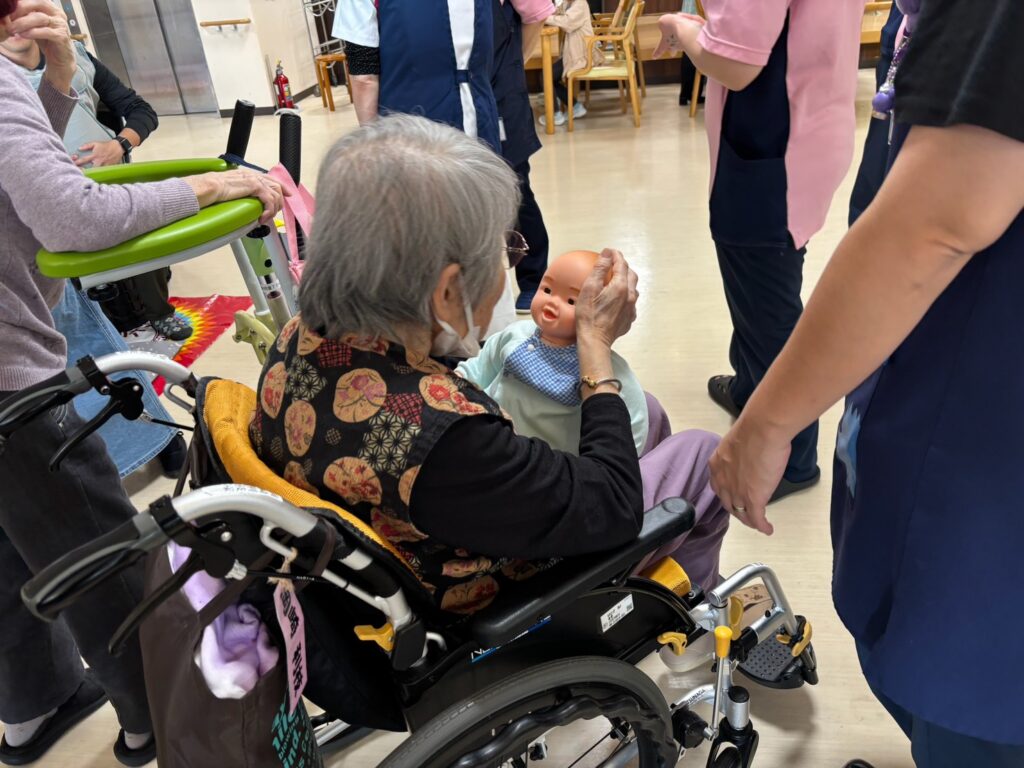 今回のイベントは地域の方だけでなく、施設利用者さんとそのご家族もたくさん遊びに来られました。縁日ブースで「懐かしいね~」と楽しむ姿や、赤ちゃん人形を使った抱っこして愛おしそうに撫でながら涙ぐむ姿も…。胸がじんと温かくなる、そんな心に残る瞬間が生まれました。
