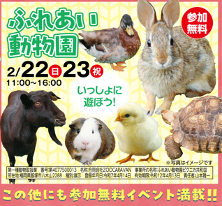 2026年2月22日(日)23日(月・祝)にはふれあい動物園が開催されます。うさぎやカメなどの動物たちと触れ合える貴重な機会ですよ~!