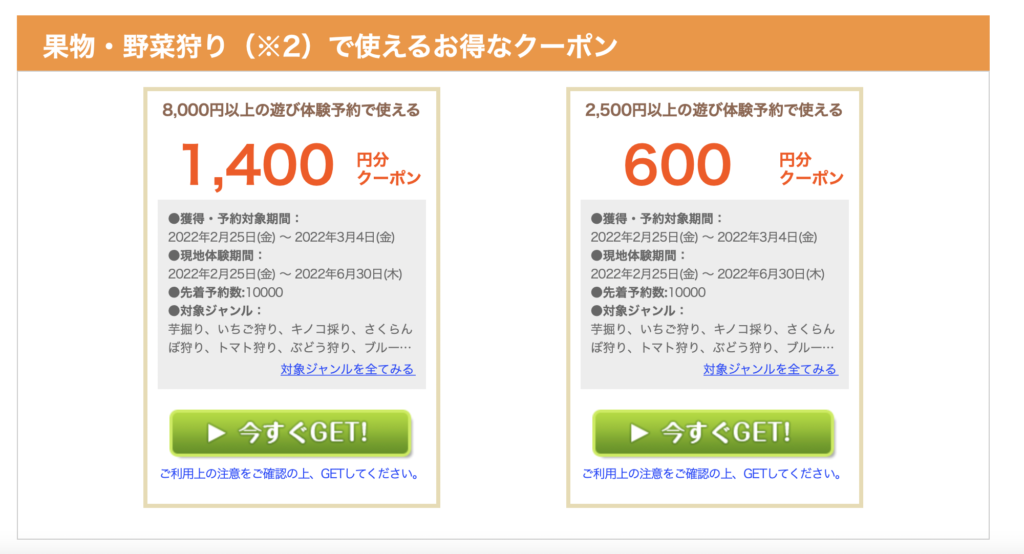 とはいえ、北九州市外のフルーツ狩りスポットに行く際は「じゃらん」で事前予約していくと、クーポンが使えてお得にお出かけする事ができるのでぜひ活用して見てくださいね♪