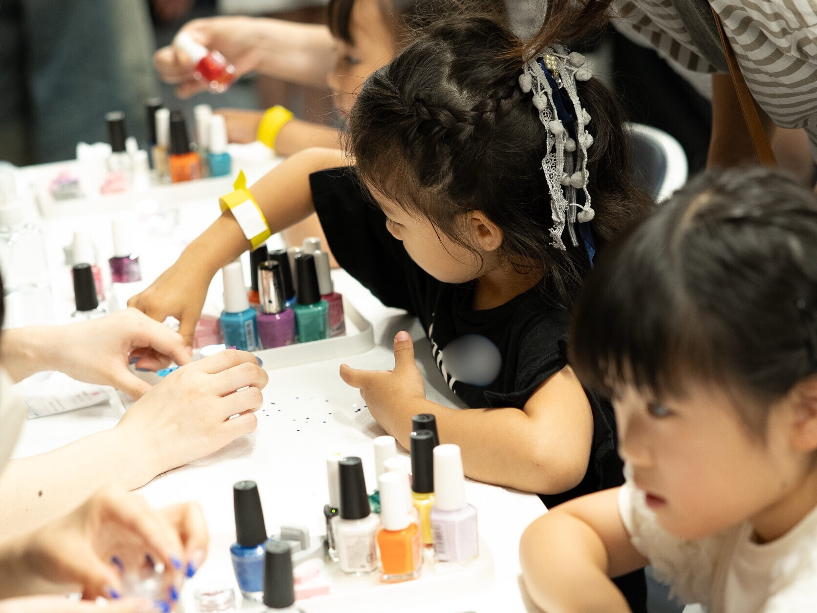 本物のハサミやバリカンを使ってカット体験をしました。髪の毛のセットも教わりました。ネイル体験では自分だけのネイルチップづくりに夢中の子どもたち。プロが使う道具に興味津々で、目を輝かせながら真剣に取り組んでいました。