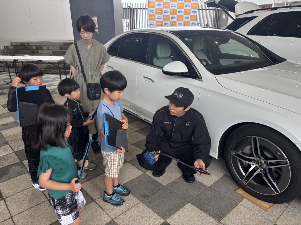かっこいい車に大興奮の子どもたち。保護者からも「すごい!かっこいい~!」という声が聞こえていました。繋ぎを着ていざチャレンジ!チェックシートにある項目を一つずつ丁寧に点検しました。最後はオープンカーの運転席「はい、ちーず!」。とっびきりの笑顔がたくさん見られました。