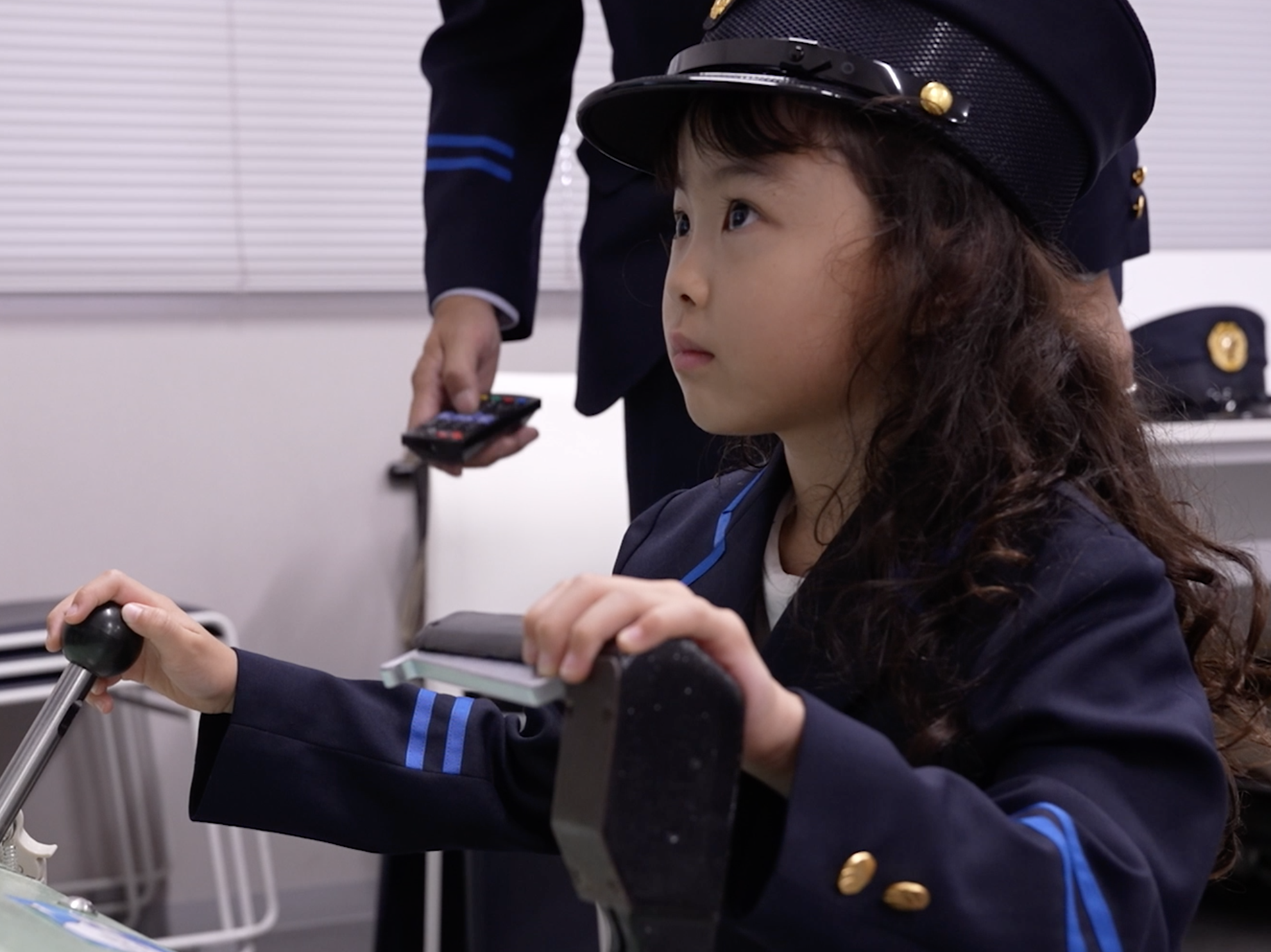 制服や帽子をかぶって準備完了!上手にアナウンスをしたり、シュミレーターで運転をしたりと、憧れの職業を楽しんでいる様子が見られました。飛び起きる布団には保護者からも驚く声が。最後には缶バッジも貰うことができて笑顔がいっぱい溢れていました!