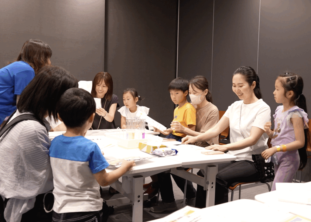 私が先生、パパママが生徒役!丸付けに挑戦しました。パパママは面白難解に悪戦苦闘。笑いが絶えないテスト時間となりました。そのあとは科学実験にもチャレンジ。「どうしてこうなるの?」と不思議そうな子どもたち。教える側・学ぶ側の両方を体験できました。