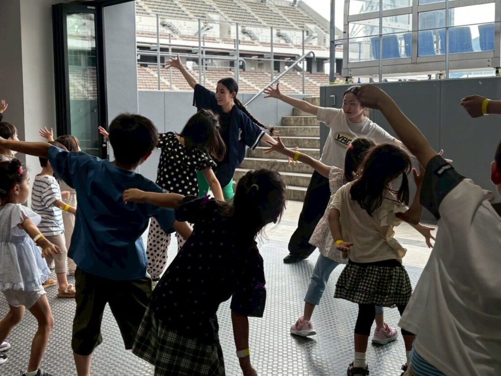 元気いっぱいのプロダンサーが楽しくダンスレッスン!しっかりと準備運動をしたあと、振り付けを教わりました。最初は恥ずかしそうに踊っていた子も、体験が終わるころには体を大きく動かしながらリズムに乗り、笑顔でダンス♪
