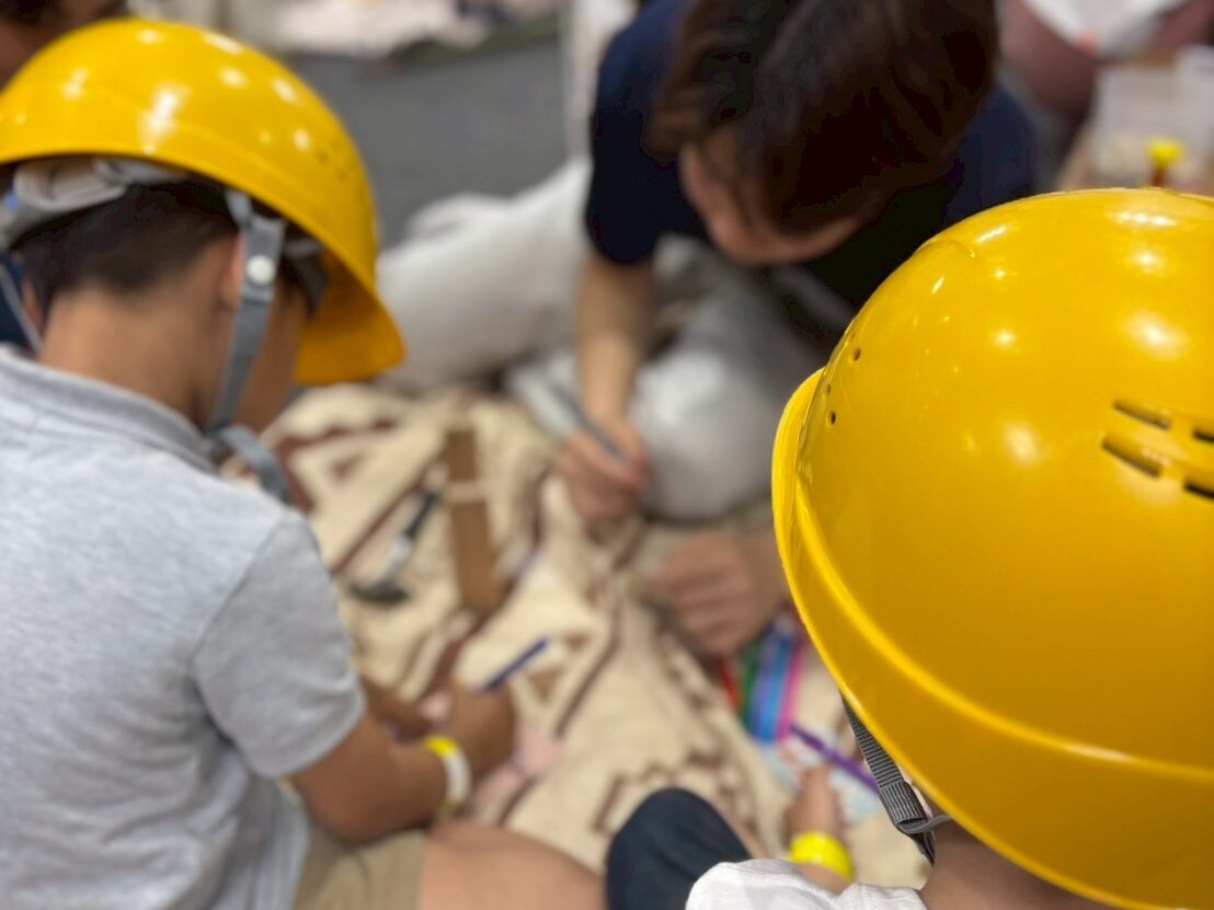 ヘルメットをかぶって大工さんになりきり、トンカチや電動ドライバーを使って大工体験。椅子やフォトフレームを作りました。子どもたちの表情は真剣そのもの。ものづくりの楽しさと、資源を大切にするSDGsの学びが詰まった時間となりました。